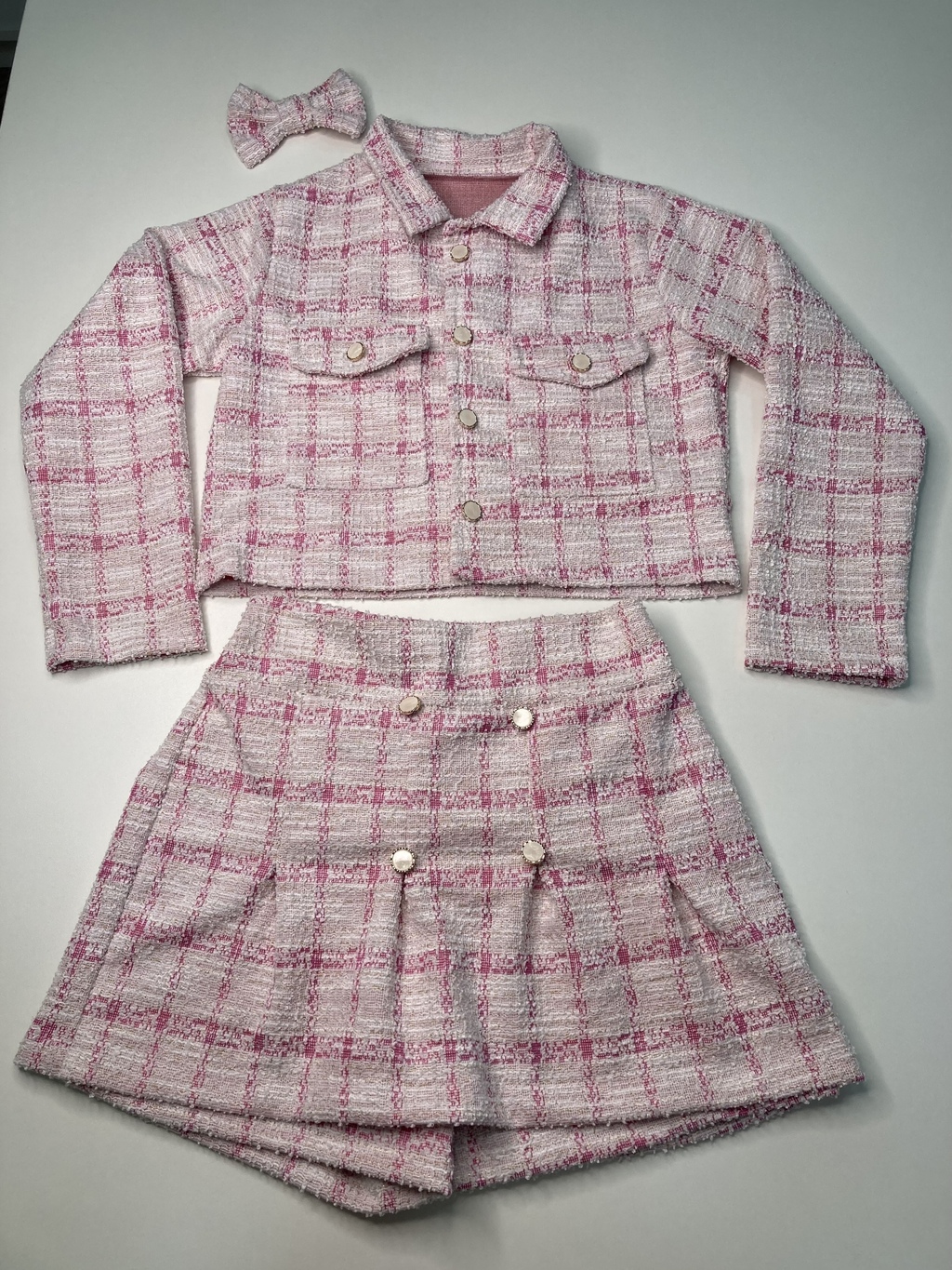 O Conjunto Em Tweed, que inclui um elegante casaco, shorts/saia e um laço para cabelo, é a escolha ideal para as pequenas que adoram estar na moda com conforto. Este conjunto traz um design encantador e versátil, perfeito para diversas ocasiões, seja um passeio no parque ou uma festinha com os amigos.