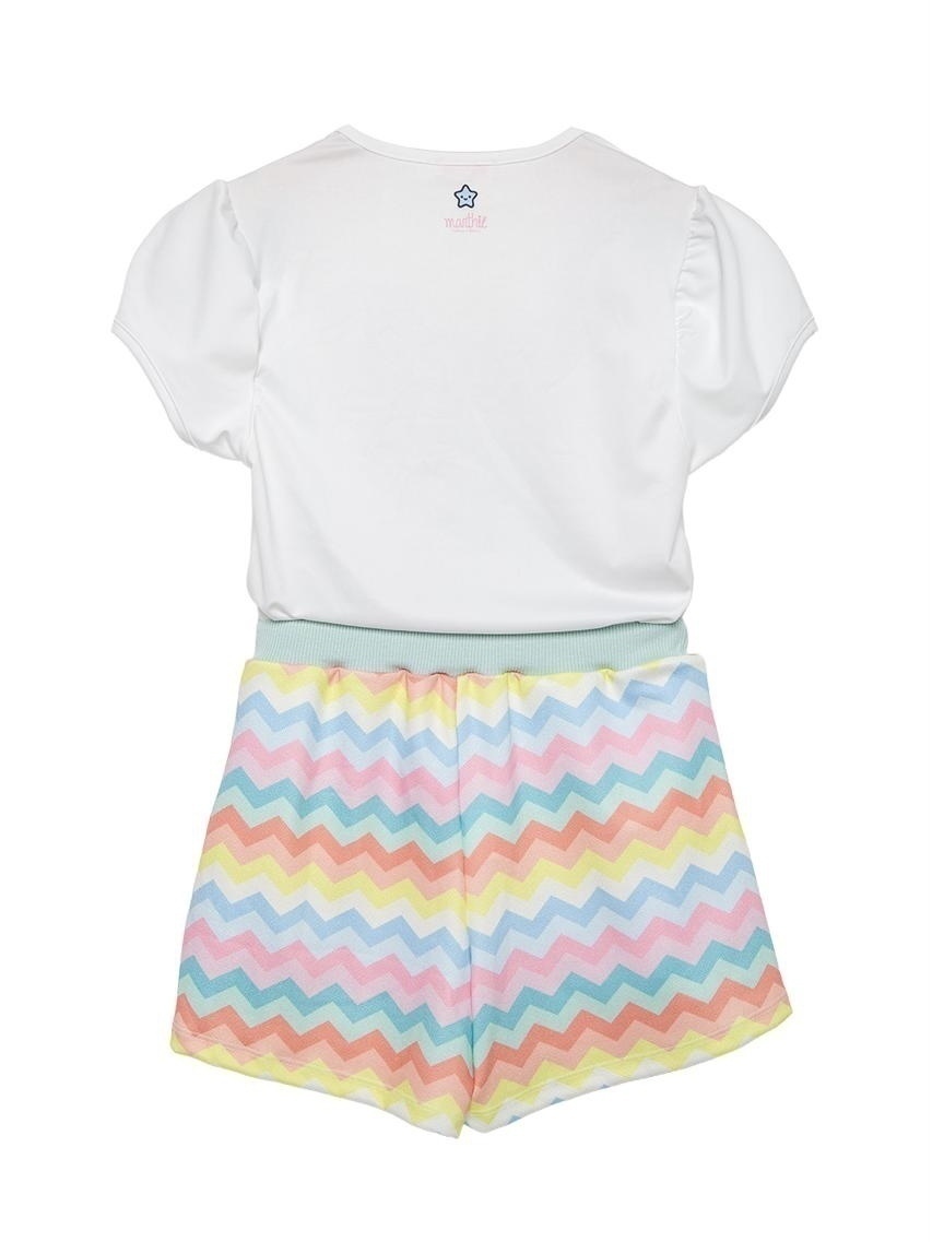 🌈 Shorts saia: Feito em malha texturizada com elastano, traz uma estampa chevron super colorida e uma modelagem moderna que une o movimento da saia com a segurança do shorts embutido. Assim, sua pequena pode brincar com total liberdade e conforto.