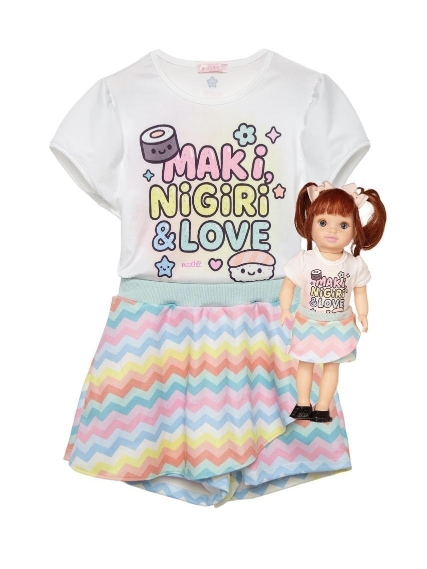 🍙 Blusa: Confeccionada em malha geladinha com elastano, proporciona um caimento suave e um toque fresco, ideal para o clima brasileiro. A estampa Kawaii apresenta comidinhas japonesas adoráveis, como sushis e makis, acompanhadas de um toque especial de strass furta-cor que adiciona brilho delicado e divertido ao visual.